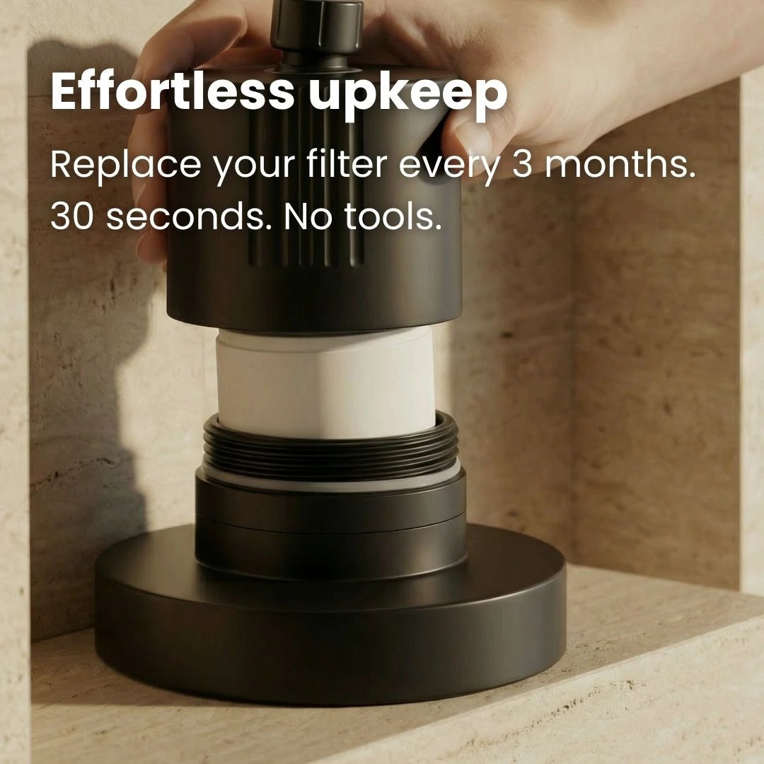 Each filter lasts approximately 90 days (about 10,000 gallons). Water Club members receive a replacement automatically, timed to arrive right when you need it. You may notice a slight decrease in water flow when the filter is nearing its end — that's the filter doing its job. Swap takes 30 seconds.